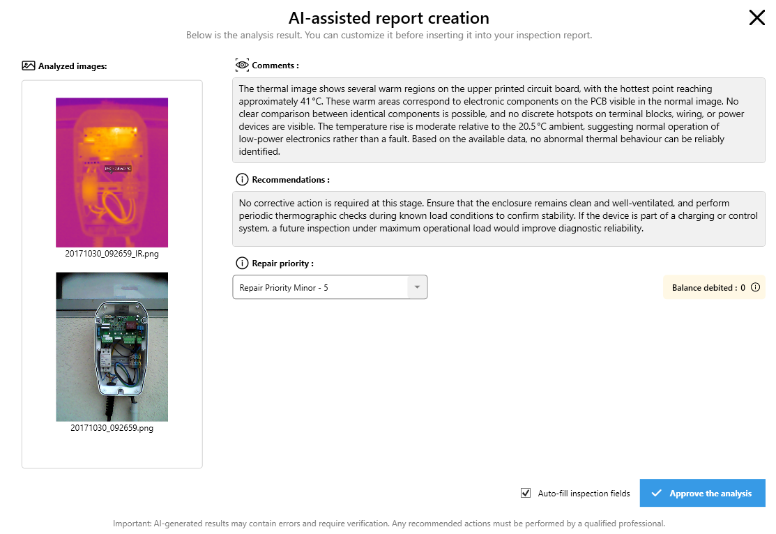 -       Aumento de la eficiencia y la precisión: refuerce sus análisis gracias a una IA entrenada específicamente en la identificación de defectos térmicos.