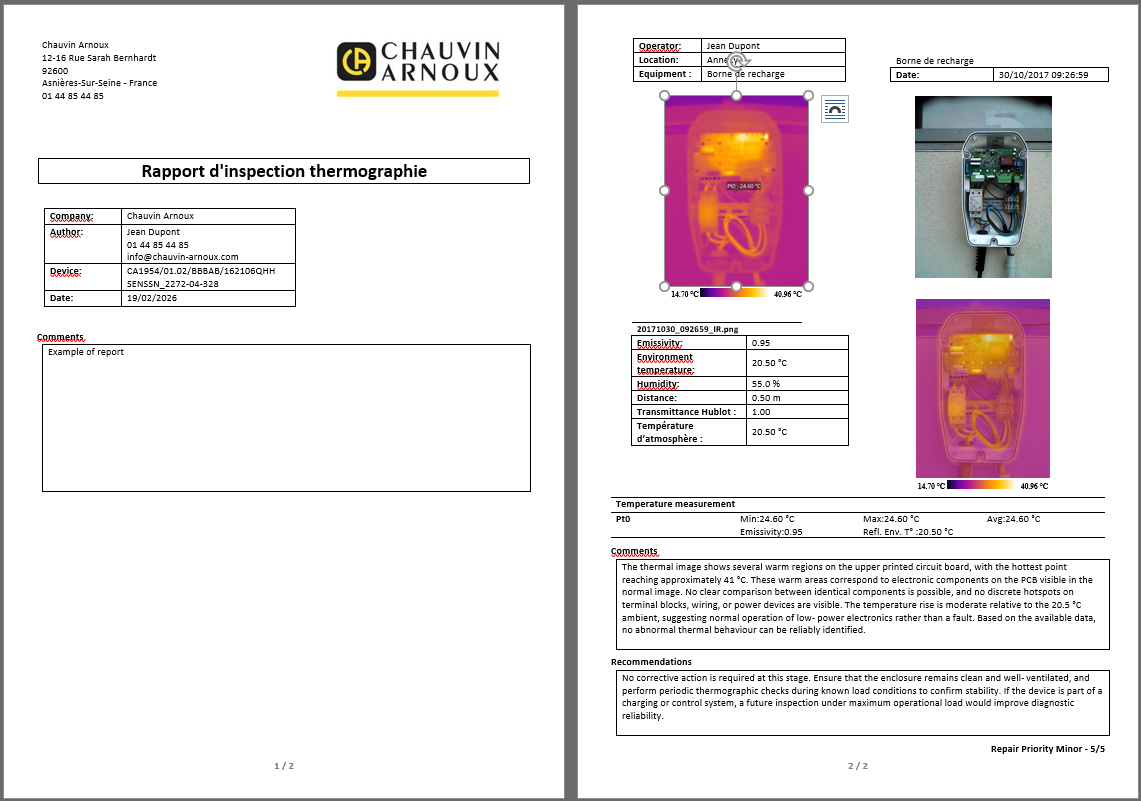 CAmReport AI es el software de análisis termográfico de Chauvin Arnoux que incorpora inteligencia artificial especializada. Le ayuda a interpretar las imágenes térmicas y genera automáticamente observaciones y recomendaciones, listas para incluir en sus informes.